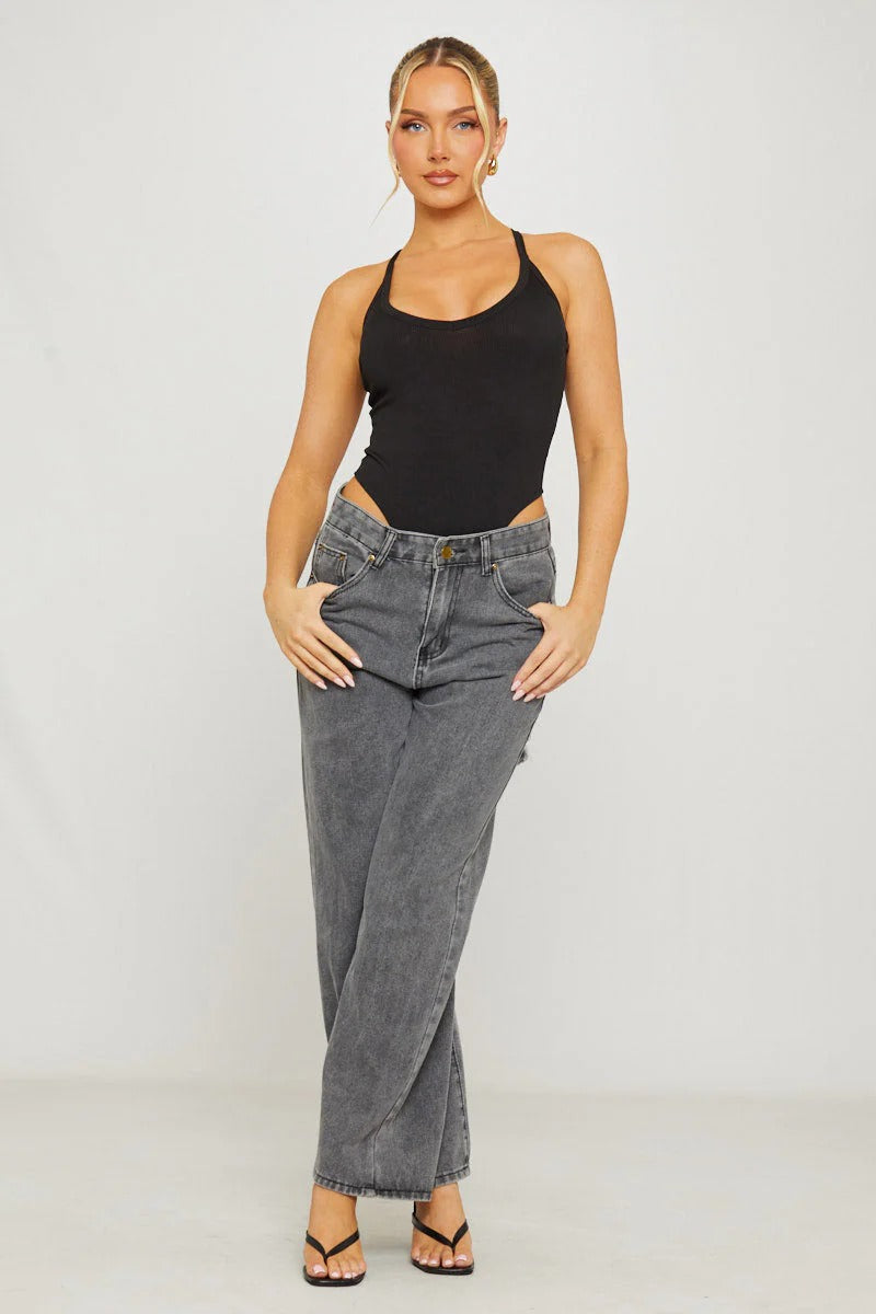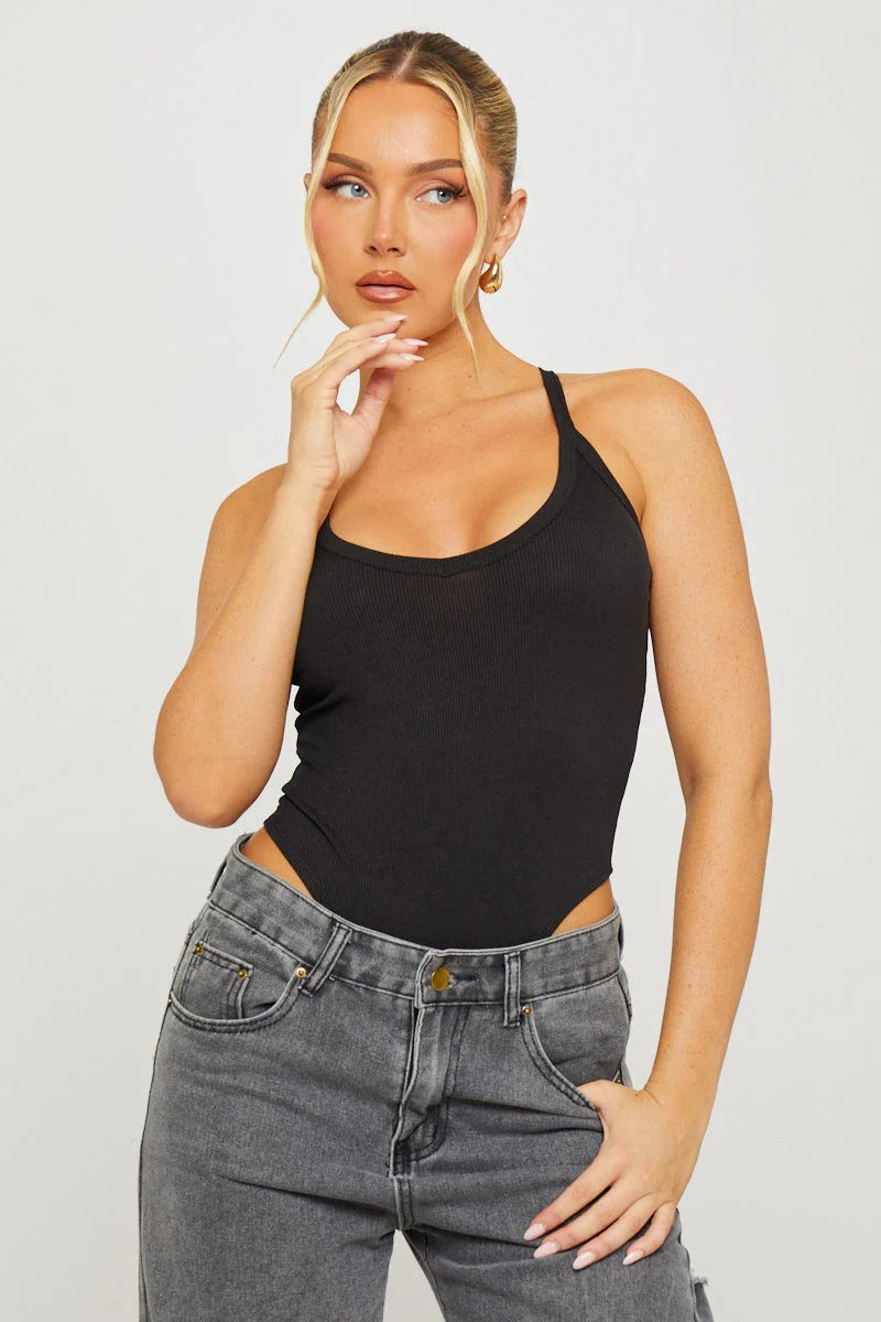 body noir côtelé à décolleté plongeant